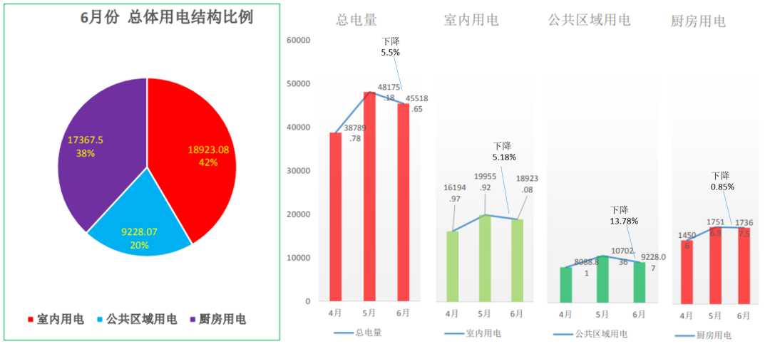 由上圖可看出,集團(tuán)6月份總用電量比5月份降低了5.5%,其中,室內(nèi)用電下降5.18%,公共區(qū)域用電量下降13.78%。