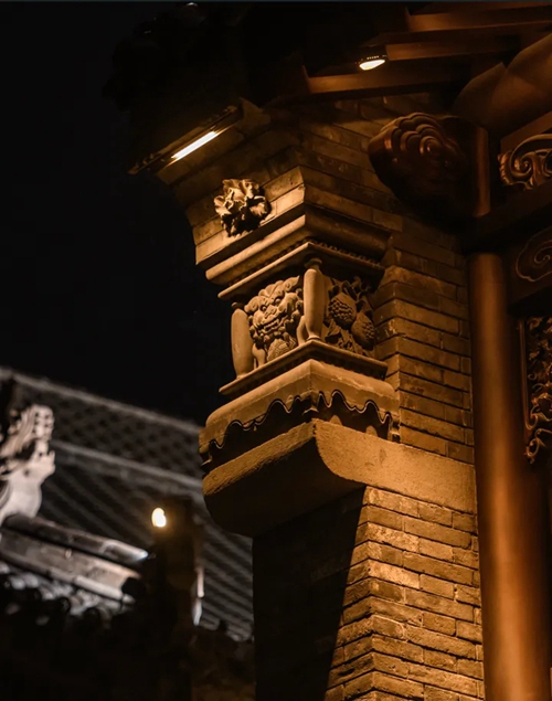 與之相對的17號樓主題為仙鶴,主題靈感來自于“仙鶴的故鄉(xiāng)”鶴壁。建筑上精美的墀頭也表達(dá)了此棟院子的主題,其上段位仙鶴,寓意松鶴延年,墀頭下端位仙鹿,寓意福祿綿長。而這處雕刻精美又涵義豐富的墀頭設(shè)計來源于河南鶴壁的古城摘星臺公園。