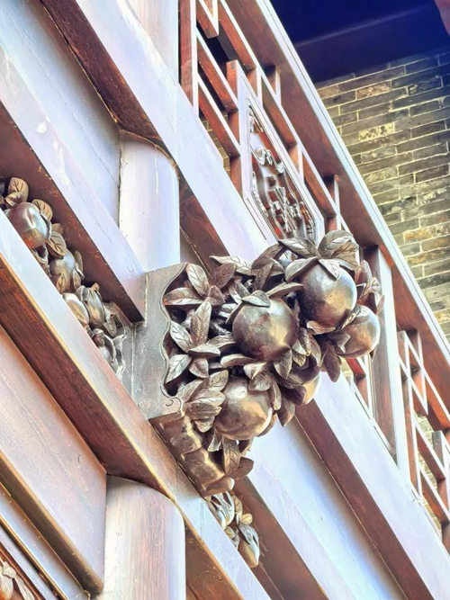 進入北門,首先映入眼簾的是16號樓,其主題為壽桃,主題來源于信陽鄧穎超祖居,祖居繡樓內(nèi)部裝飾有壽桃石雕,我們便選取此圖案進行創(chuàng)作,在16號樓的墀頭、雀替、卡子花處均有精美的壽桃紋樣。