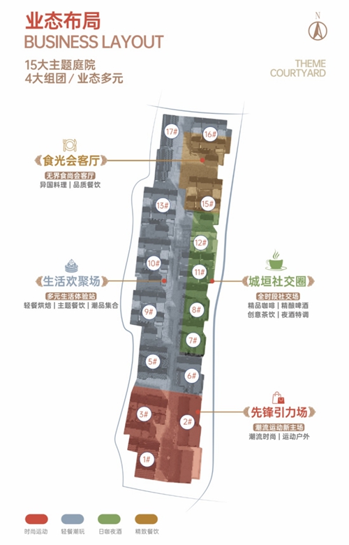 (十五個(gè)院落、四大組團業(yè)態(tài)分布示意圖)