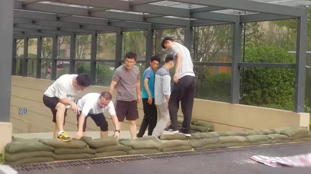 在金岱科創(chuàng)城鄭地發(fā)展公司市政道路提升改造現(xiàn)場,公司負(fù)責(zé)人帶隊(duì)檢查每條道路的沙袋、隔離護(hù)欄等防汛措施準(zhǔn)備情況。在金岱科創(chuàng)城商務(wù)服務(wù)中心,針對下沉庭院等有深基坑可能發(fā)生嚴(yán)重積水內(nèi)澇的點(diǎn)位,公司提前謀劃,協(xié)調(diào)發(fā)電機(jī)和水泵并安裝調(diào)試到位,確保一旦發(fā)生停電積水等極端情況,立即進(jìn)行抽排。在商務(wù)服務(wù)中心一樓大廳,公司將LED大屏等電子信息設(shè)備進(jìn)行防水覆蓋,同時(shí)對可能發(fā)生滲水的部位進(jìn)行排查加固,確保公司重要資產(chǎn)不受損失。
