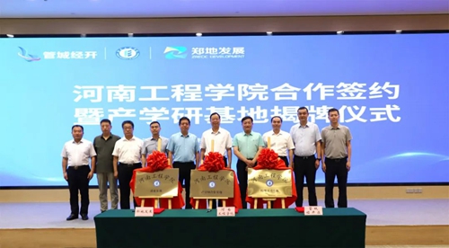 會上,河南工程學院、管城經(jīng)濟技術(shù)開發(fā)區(qū)管理委員會、河南鄭地產(chǎn)城融合建設(shè)發(fā)展有限公司共同簽署產(chǎn)學研合作協(xié)議,并現(xiàn)場為河南工程學院校外實習基地、產(chǎn)學研合作基地、就業(yè)基地揭牌。