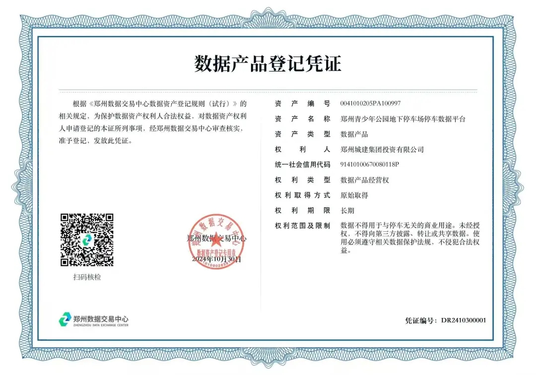 10月30日,城發(fā)集團(tuán)下屬子公司鄭州城建集團(tuán)投資有限公司(以下簡稱“城建集團(tuán)”)在鄭州數(shù)據(jù)交易中心成功完成了“鄭州青少年公園地下停車場停車數(shù)據(jù)平臺”數(shù)據(jù)產(chǎn)品的資產(chǎn)登記,喜獲數(shù)據(jù)產(chǎn)品登記憑證,成為鄭州市首家將停車數(shù)據(jù)資產(chǎn)入表的國有企業(yè)。