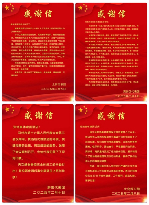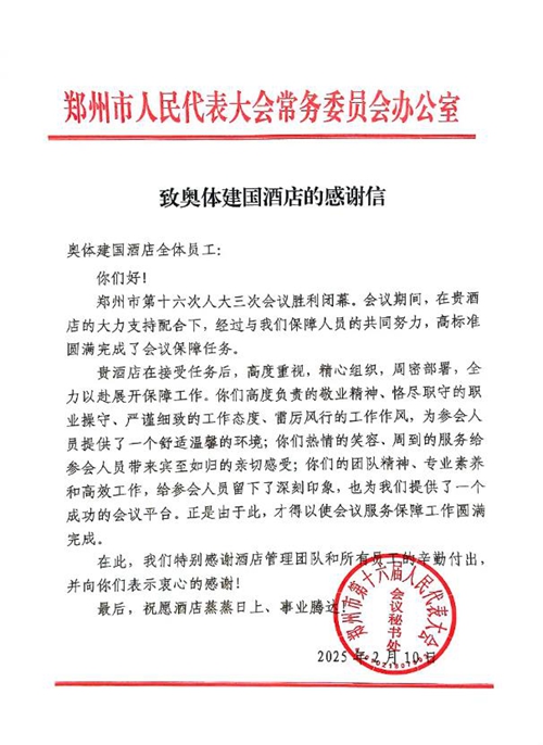 2025年2月10日,鄭州市第十六屆人民代表大會第三次會議第二次全體會議勝利閉幕。鄭州城市發(fā)展集團旗下河南鄭地奧體建國飯店作為本次大會的駐地保障酒店,以“五星”服務標準(環(huán)境舒心、食宿貼心、細節(jié)暖心、保障安心、文化潤心),圓滿完成了各項接待任務,贏得了與會代表和會務組的一致好評。