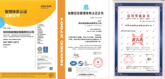 結(jié)合2019年取得的質(zhì)量管理體系(ISO9001),鄭房測繪已成功通過“三標(biāo)體系”認(rèn)證。這些榮譽(yù),不僅是公司在規(guī)范化運(yùn)營、風(fēng)險(xiǎn)防控、精細(xì)化管理等維度交出的優(yōu)異答卷,更標(biāo)志著公司企業(yè)綜合實(shí)力和核心競爭力的增強(qiáng),顯著提升公司品牌形象與市場信譽(yù)度,增強(qiáng)客戶對企業(yè)的信任,為深耕測繪地理信息市場奠定堅(jiān)實(shí)基礎(chǔ),為開啟管理升級(jí)與戰(zhàn)略躍升譜寫新篇章。