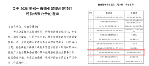 近日,鄭州市物業(yè)管理協(xié)會(huì )官網(wǎng)發(fā)布《關(guān)于2025年鄭州市物業(yè)管理示范項目評價(jià)結果公示的通知》,城發(fā)·金岱智慧產(chǎn)業(yè)園獲評“鄭州市物業(yè)管理示范項目”。